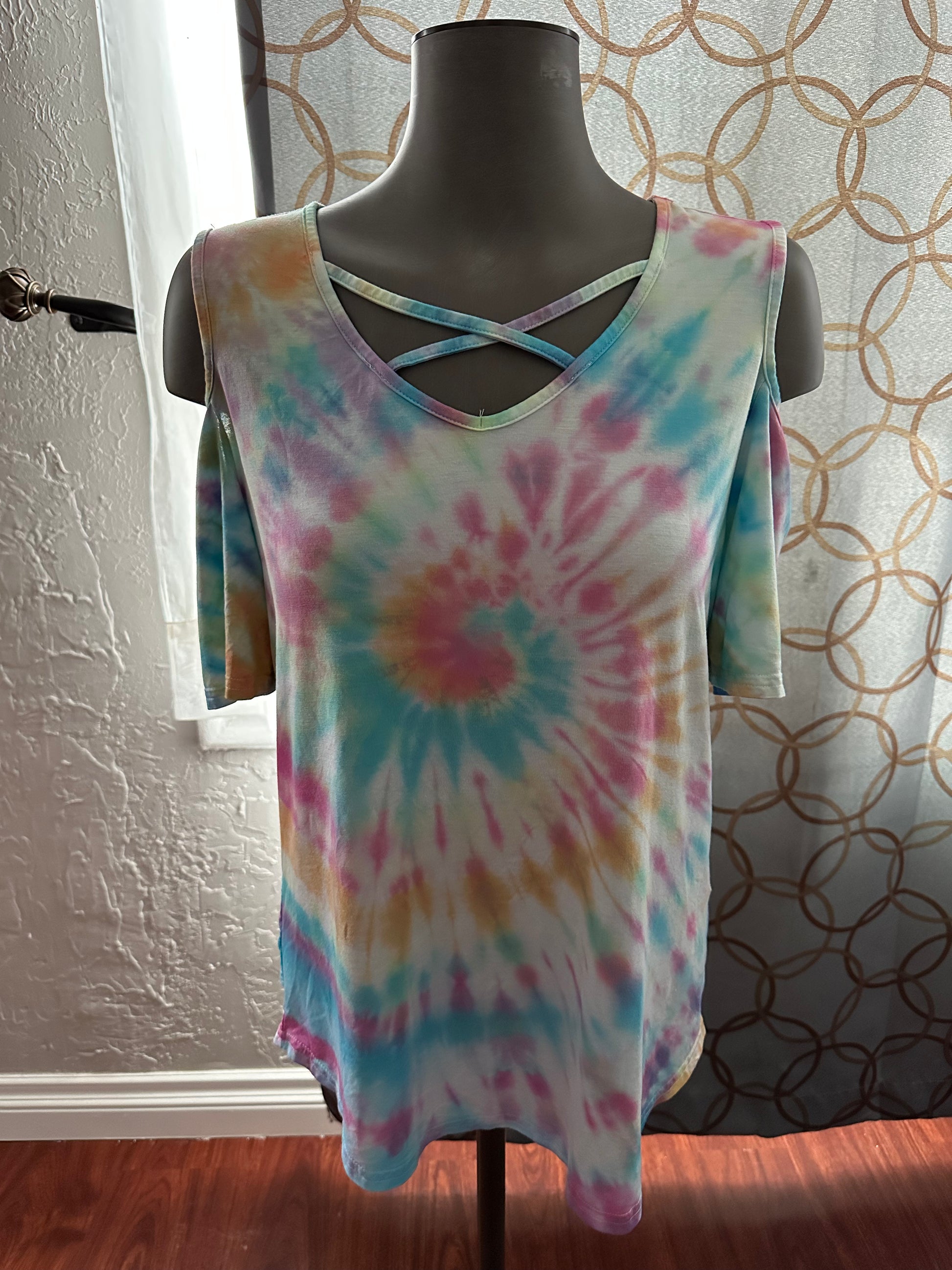 Let your soul shine in this dreamy cold shoulder tee, complete with a flirty cross v-neck and a whole lotta color magic! Hand-dyed in a swirling spiral of magenta, aqua blue, purple, and orange—this one’s bursting with good vibes and summertime energy. Each piece is one-of-a-kind, just like you. ✌️✨